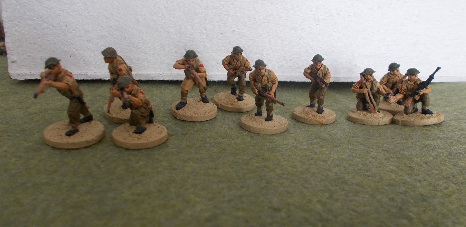 To back up Alex, I've also completed another rifle section, this time in battledress trousers and KD shirts - a look more associated with the troops after moving on to the Italian mainland than in Sicily, but these are lovely figures. The metal soldiers were one man short, so they've been joined by one more plastic figure (in shorts) from the Perry's Desert Rats box. As usual, I've marked the rear of the bases to help show which section they belong to.